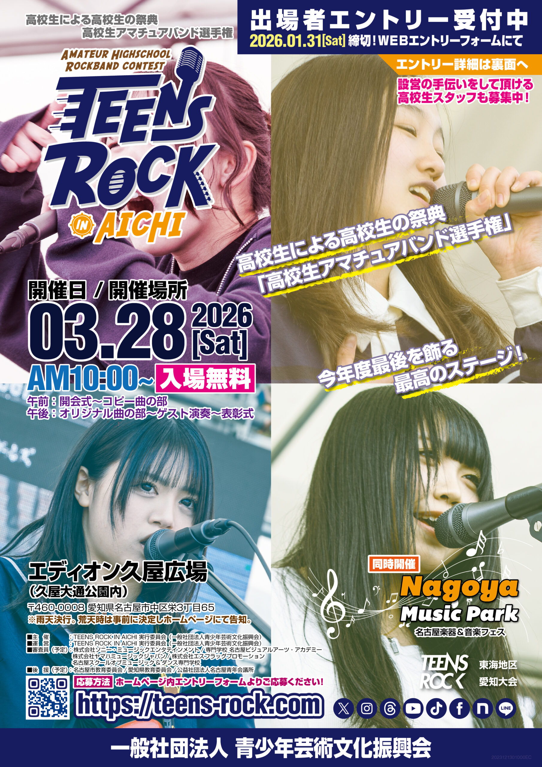 高校生による高校生のためのバンド選手権、TEENS ROCK IN AICHI 2026が開催されます!「久屋大通公園/エディオン久屋広場」での開催です!